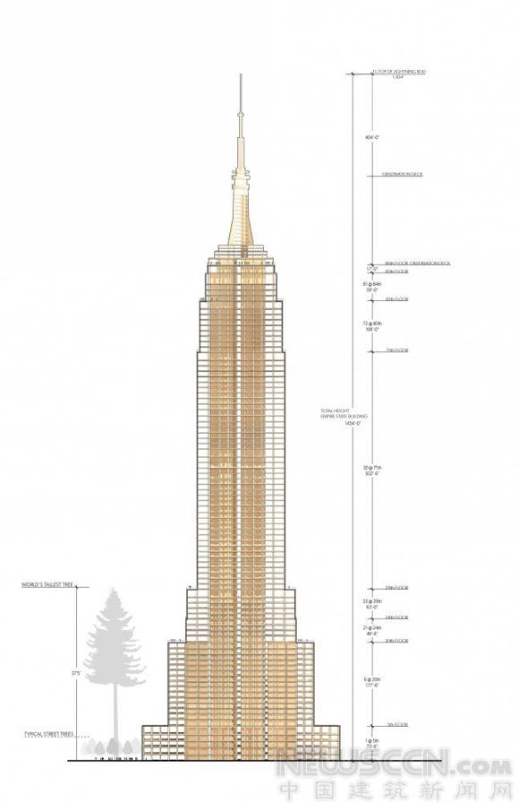 修改設計后的木質版本帝國大廈利用創新工程鏡像技術的完整的復制了原建筑的尺寸及外形。始建于1931年,最初的帝國大廈是代表著鋼鐵材料的興起、創新的能力的迸發,同時完全改變了建筑和建筑師之后的設計。通過重建帝國大廈在這樣一個激進的方式, Metsä Wood和Michael Green希望傳達出一個信號,木材有可能成為21世紀的鋼鐵。